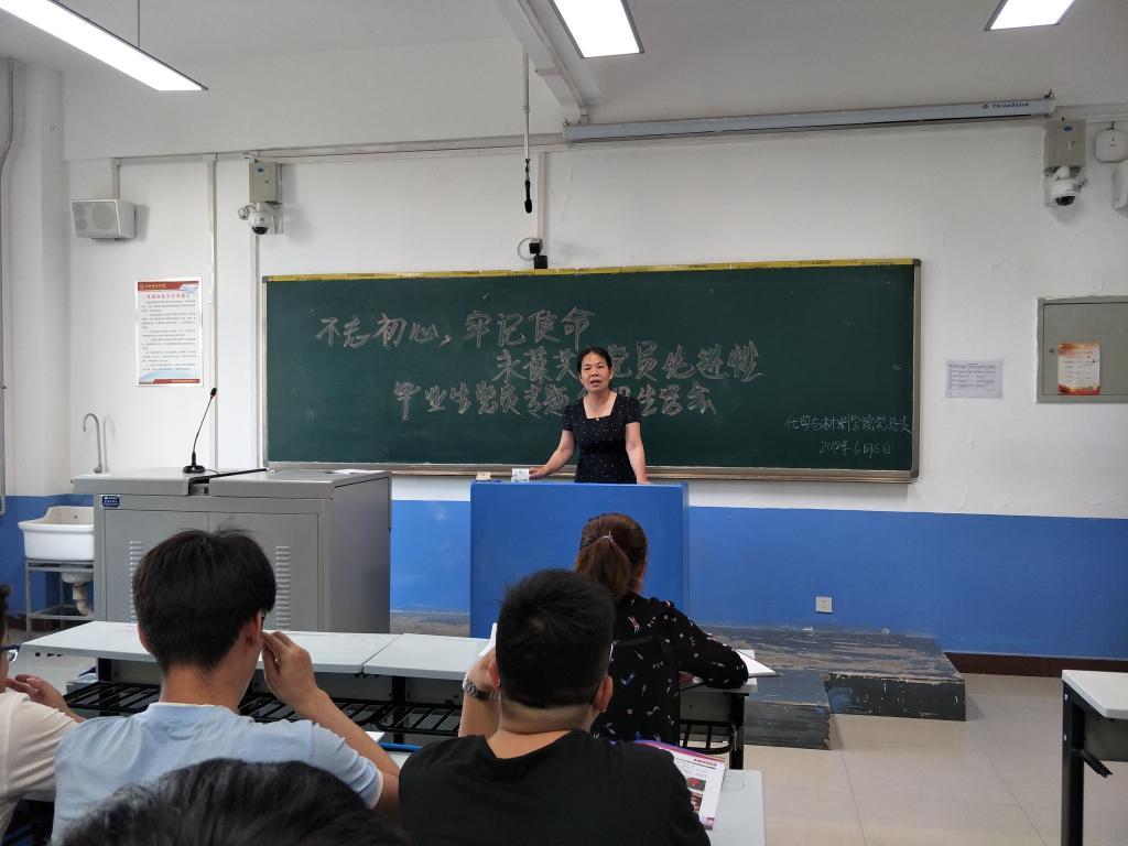 毕业生党员代表丁孟颖在发言中表示,感谢学校、学院和老师们的培养和教育和辛勤付出。她代表毕业生党员郑重承诺,将在老员工活的最后阶段继续保持和发挥党员的先锋模范作用,做文明离校的带头人。走向社会后也将严格要求自己,时刻保持党员先进性,主动承担责任和义务,勇于开拓,敢于创新,为党旗增光添彩。