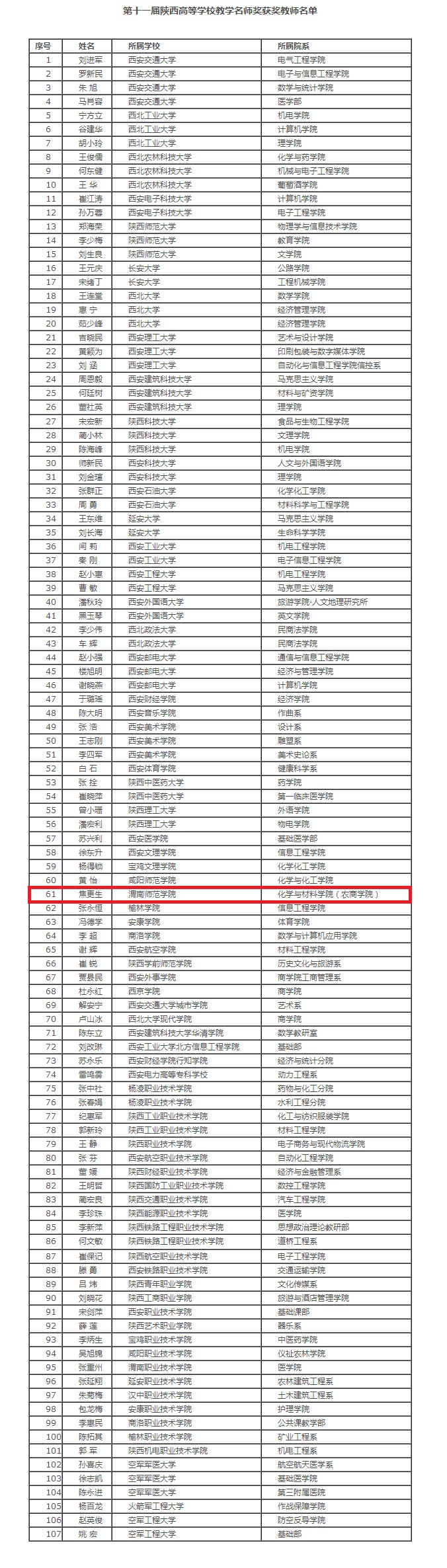 据悉,第十一届陕西普通高等学校教学名师奖评选活动共评选出107位省级教学名师。经学校推荐、申报公示、专家评选、厅务会审议、结果公示等工作程序,焦更生教授顺利通过评选。