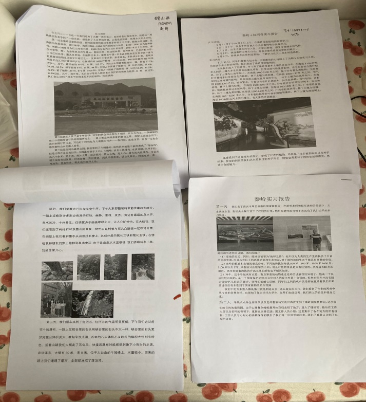 (2)第二天对秦岭植物多样性进行了解,并采集一定量标本,主要对现代农耕(含植物种植)、水生植物、陆生植物、湿地等方面见习内容,同时野外观察岩石构造,如褶皱、节理、断裂,观察风化作用的类型,观察、描述见习区域常见岩石的物质组成、结构、构造等特征,。
