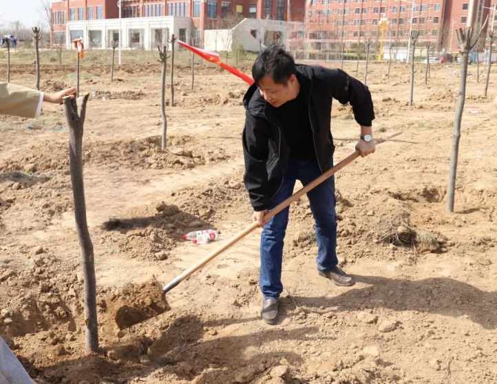 同学们挥锹铲土、扶直树苗,各个环节都一丝不苟、井然有序,植树活动现场呈现出一派忙碌景象,展现了无私奉献、团结互助的精神风貌。在分工协作、干劲十足的的氛围中,老师和同学们饱含着希望、责任和感情,栽下了一株株新苗。
