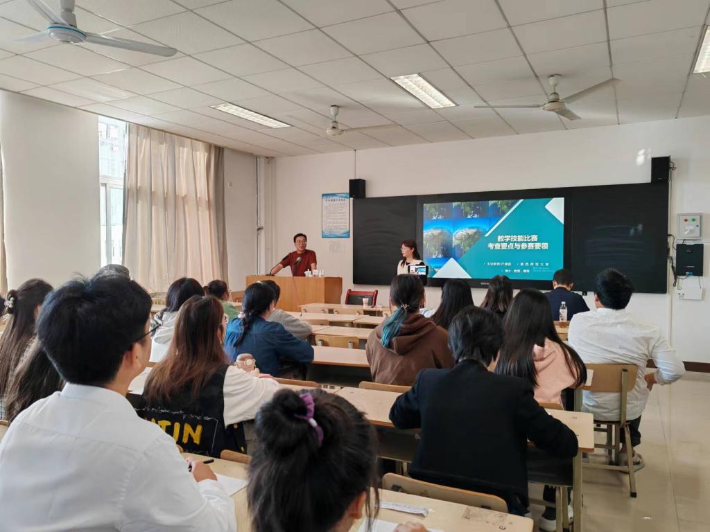 户清丽教授用通俗易懂的语言,以往届参赛作品的实例,深入浅出地从师范生个人基本素质、教学基本功、教学设计能力、教学实践能力、比赛中常见失误、备赛参赛方略六方面进行了详细的讲解,特别提出了教学基本功的训练要练在平常,践行在日常。她提出一要对标中学教材和课程标准,了解中学学科知识体系;二要多听专家讲座和基础教育课程改革的专题报告,了解课改前沿;三要积极参加课堂教学活动,提升与人合作和交往的能力;参加教学技能训练和比赛活动,提升教学能力。四要观摩学习一些优秀老师的上课视频,汲取教学智慧。