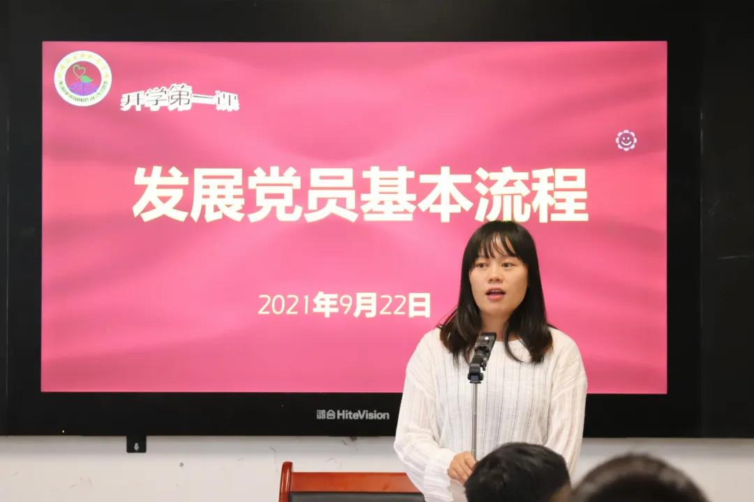 党务秘书冯雨对入党的基本条件和流程进行了详细介绍,让新生们对如何向党组织靠拢有了更深入的了解,对未来的发展作出了更清晰的规划。最后,她对同学们入党提出了殷切的希望与期盼,引用了习近平总书记给复旦大学青年师生党员回信中的一句话来勉励各位学子“心有所信,方能行远。”