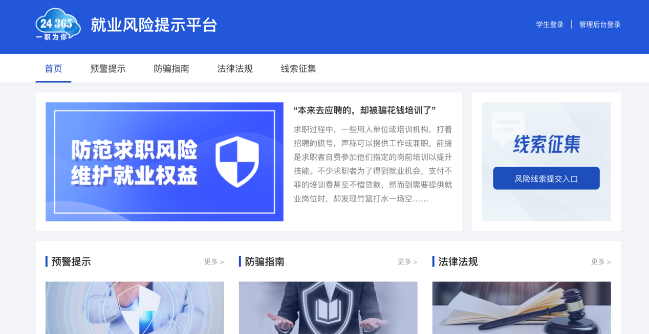 通过对预警提示,防骗指南,法律法规、三大模块的学习,防范求职风险,维护就业权益!