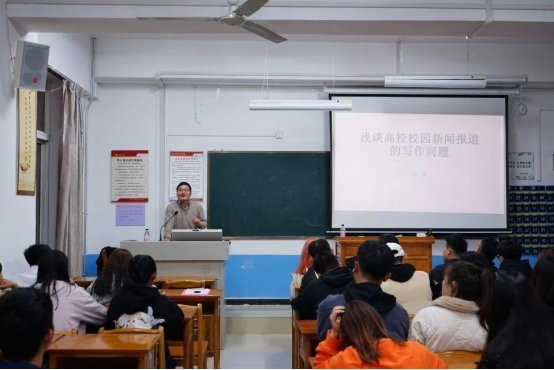 张涛老师以“浅谈高校校园新闻报道写作问题”为主题,从新闻报道的五大基本要素、新闻价值、写作技巧以及写作态度四个方面进行了讲解。在讲解过程中,他引用大量实例,直观、清晰地向同学们展示了新闻报道写作的要点。