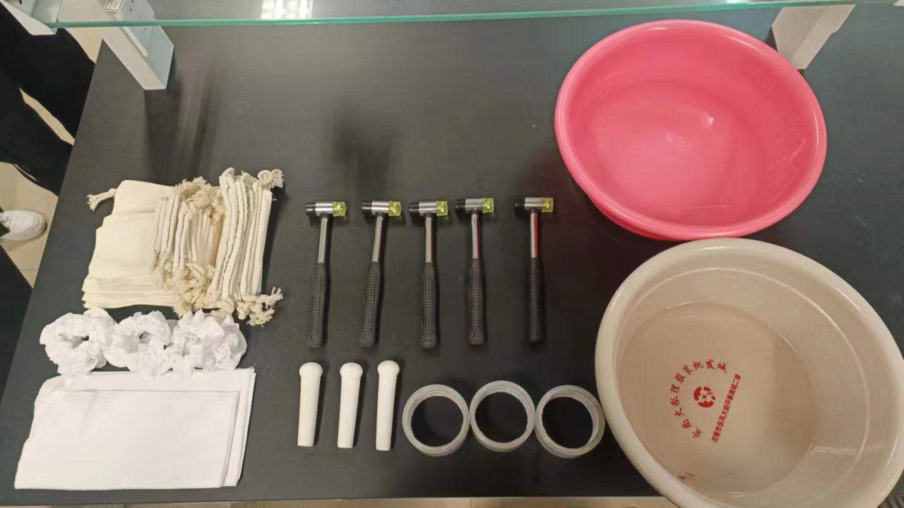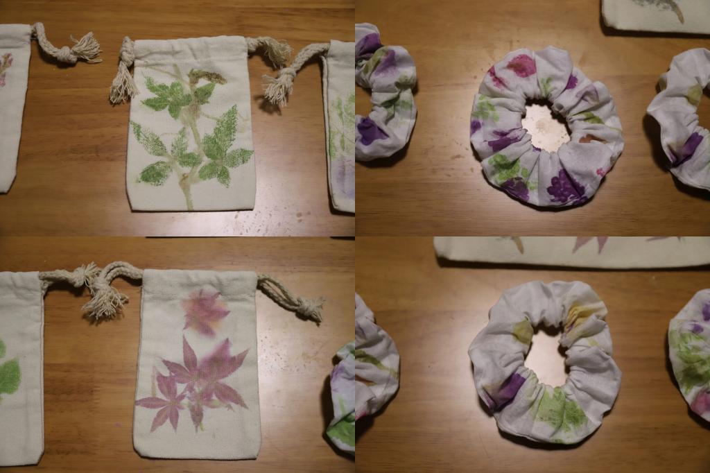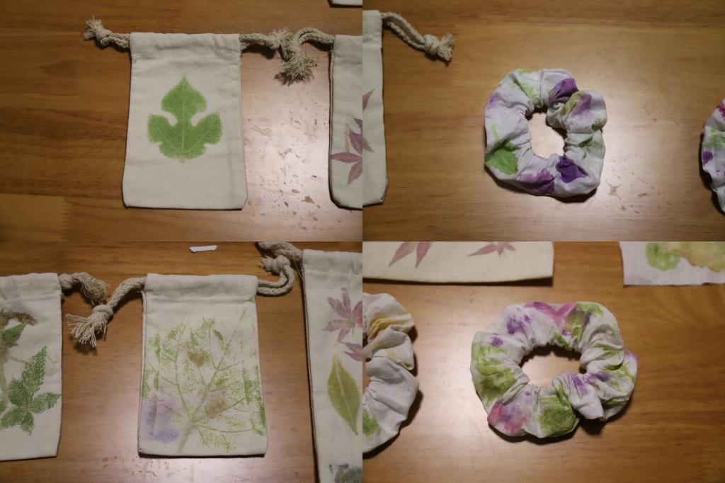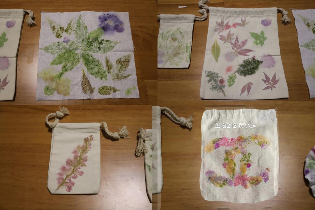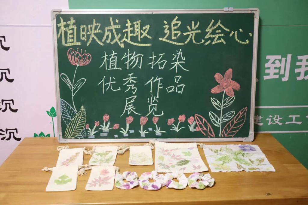 一切准备就绪后活动正式开始,首先,同学们将采摘的植物叶片和花朵浸泡于明矾溶液中,经过15分钟的漫长等待后,取出所浸泡的植物材料,在心仪的物品上摆放出想要拓印的图案并用透明胶带固定,开始了整个活动过程中最关键的一步:拓染。经过敲打,独属于该植物的纹路、色泽、图案都呈现出来了。每个作品都蕴含着自己独特的创作特色,一幅幅精美的植物拓染作品映入眼帘。