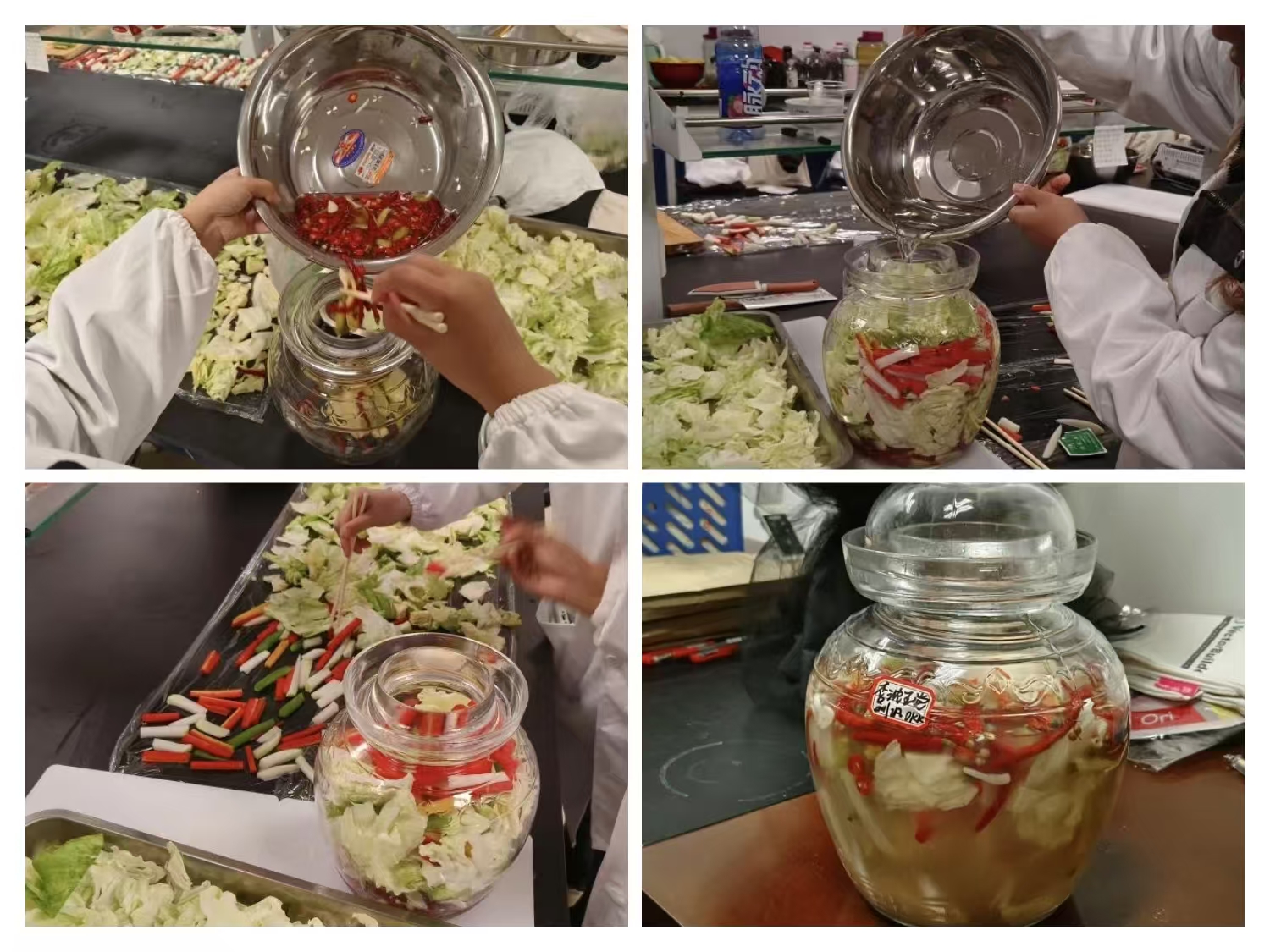 在老师指导下,同学们开始腌制美味泡菜。蔬菜经过前处理后平铺将水分晾干,根据配方在容器中加适量盐,再放入香叶、花椒、辣椒等调料,搅拌均匀制成腌渍液。装坛前使用高度白酒为泡菜坛杀菌消毒,将处理好的蔬菜放入泡菜坛,再倒入腌渍液,装至八分满。最后放乳酸菌,加入少量白酒,盐水封坛放避光阴凉处,各小组在泡菜坛上做好标记,经过时间的沉淀,一坛坛美味泡菜就此诞生。