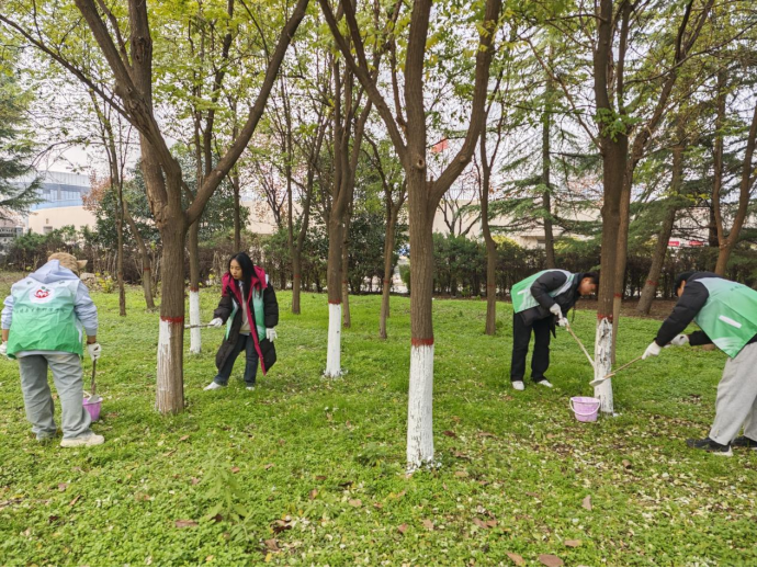 在同学被整齐地刷上了洁白的保护层,成为了冬日校园里一道靓丽的风景线。这不仅为树木提供了必要的保护,也让员工在实践中学习到了冬季树木保护的知识和技能,增强了他们的环保意识和实践能力。
