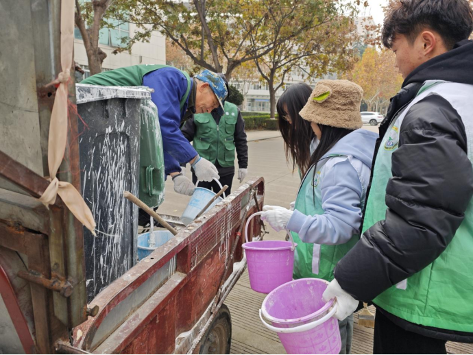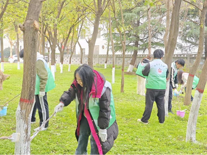 随后,工作人员为同学们分发了刷子、桶等工具,同学们迅速投入到了树木刷白的工作中。他们手持刷子,专注而细致地为校园内的树木涂抹保护层,确保每一棵树都能得到充分的保护。同学们的热情高涨,他们不怕脏、不怕累,认真地为每一棵树干穿上“冬衣”。