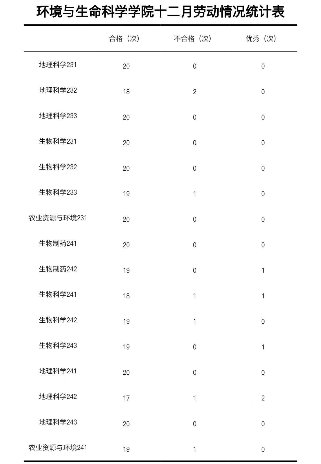2024-2025学年第一学期十二月份(12月2日—12月27日)公司学习生活部对校园清洁区和教室卫生进行了40次检查,其中表现优秀班级4个,共计5次;合格班级10个,共计308次;不合格班级6个,共计7次。具体情况如下表: