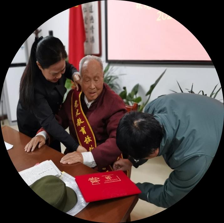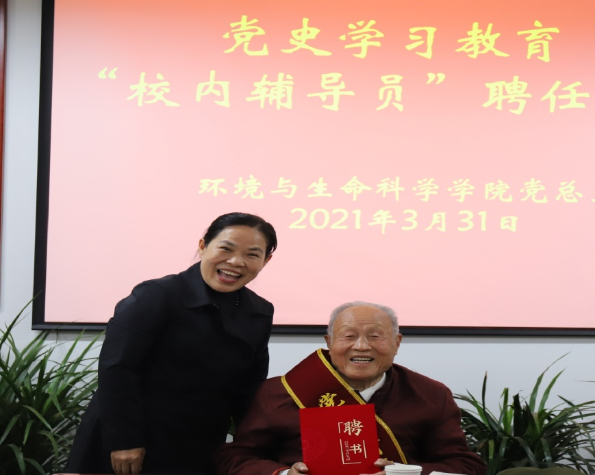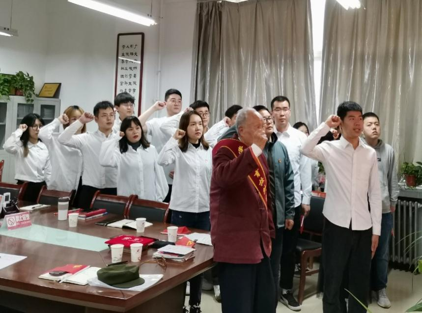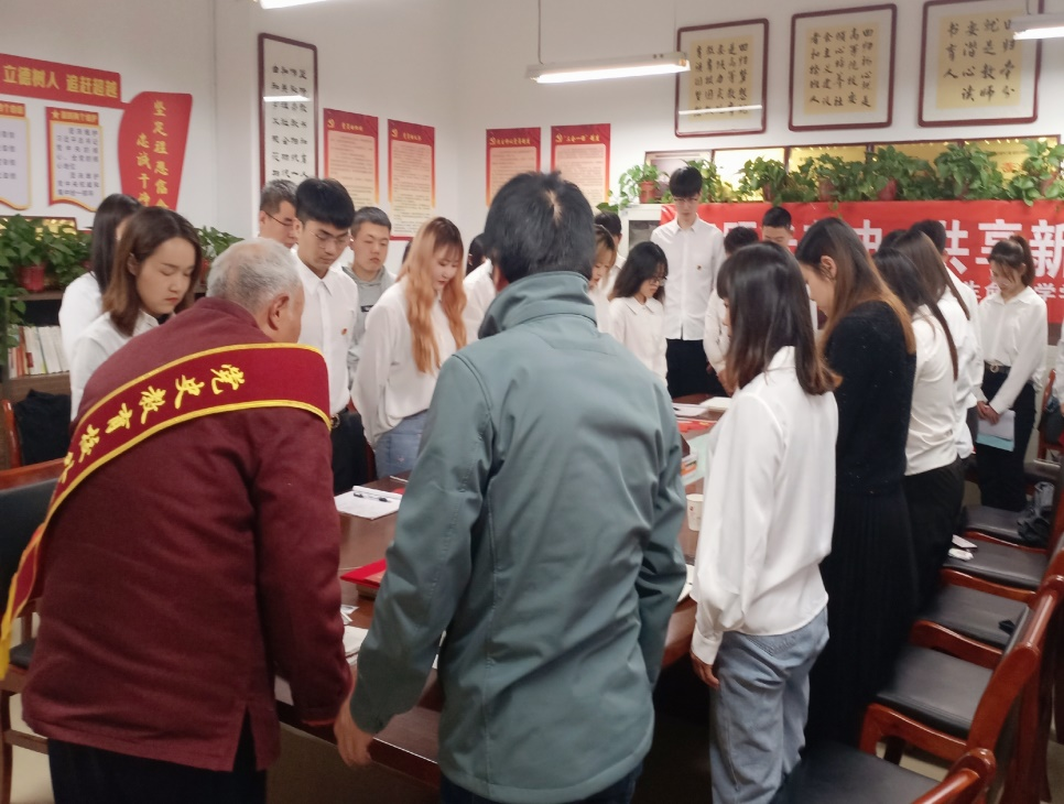 会上,党总支书记孙永秀同志代表学院向老人颁发了聘书,聘请傅自善同志为公司党史教育“校内辅导员”,并为老人戴上绥带。