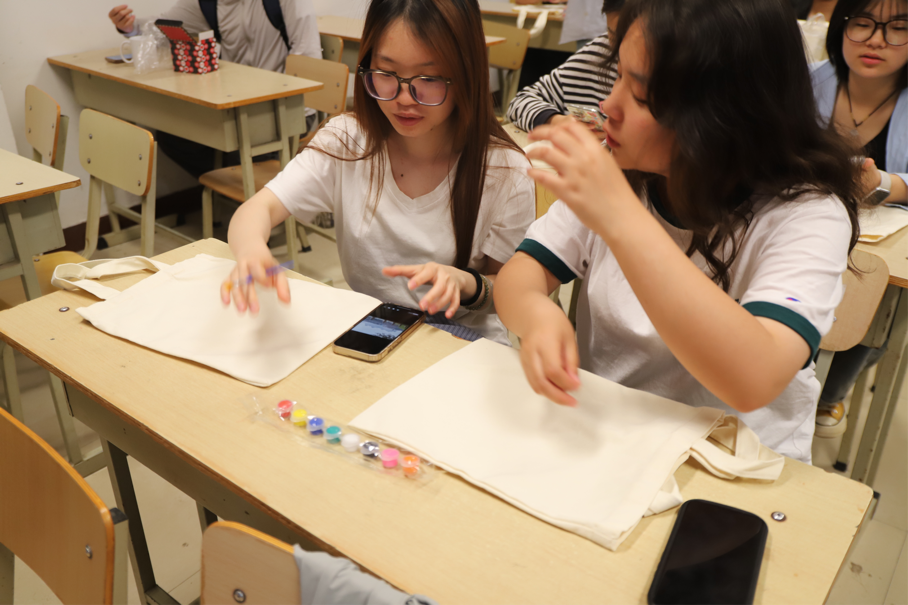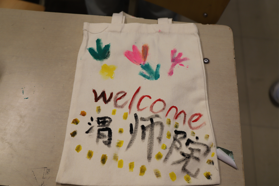 活动伊始,主持人向同学们做活动介绍,工作人员分发活动材料,同学们两两一组,选择马克杯或布袋为材料进行绘画。